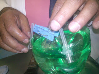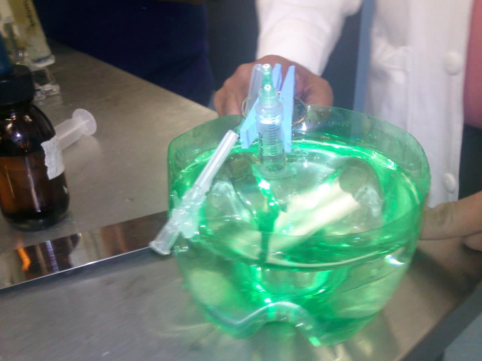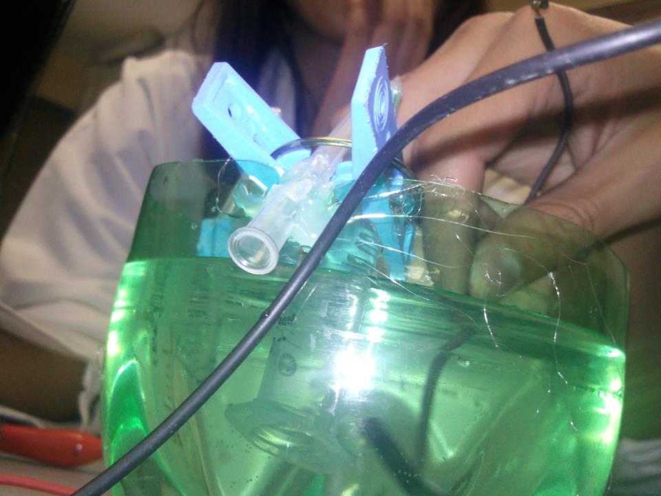 1. En el recipiente de plástico pegar por fuera las protecciones de las agujas con cinta adhesiva o silicón.