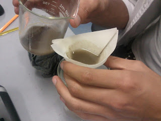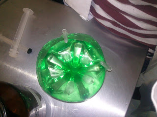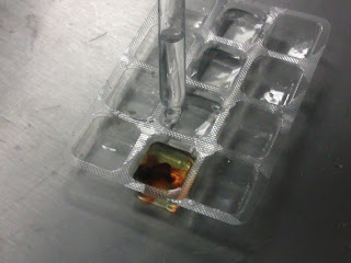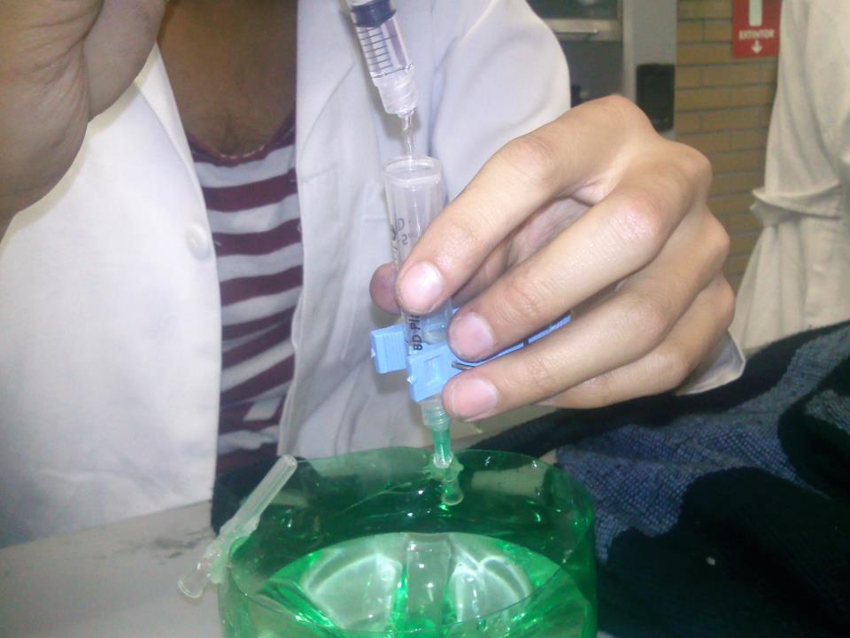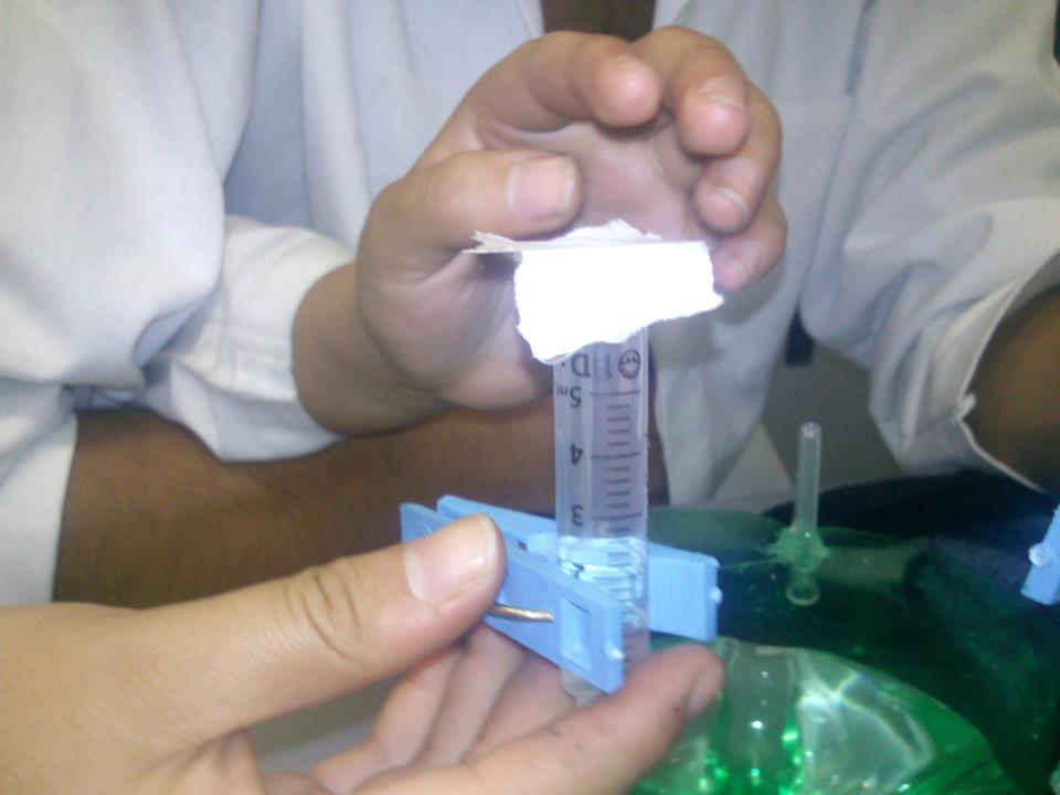 5. Con las pinzas, sujetar las jeringas de 5 ml. y llenarlas con la disolución de KI (para llenarlas utilizar la jeringa de 3 ml.).