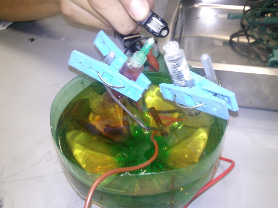 6. Se introducen las jeringas de 5 ml. En el recipiente y se sujetan las pinzas de las protecciones de las agujas.